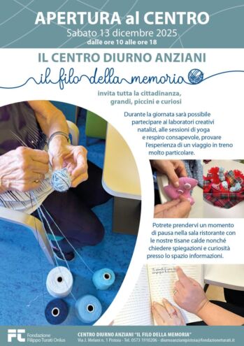 Sabato 13 dicembre 2025 dalle ore 10 alle 18 il Centro diurno per persone anziane «Il filo della memoria» apre le porte alla cittadinanza, offrendo alle famiglie e a tutti gli interessati l’opportunità di conoscere i suoi spazi, nonché di sperimentare laboratori e attività. La struttura, nata lo scorso anno per rispondere ai bisogni del territorio, si trova in via J. Melani 1 a Pistoia (nella zona dell’auditorium Panconi) ed è autorizzata per 20 posti in nucleo cognitivo. Gli arredi rispondono a specifici requisiti per la terapia non farmacologica dei disturbi cognitivi, sulla quale lo staff è formato, e sono mirati al benessere della persona. «Il filo della memoria» è un luogo protetto e sicuro, adatto a favorire la socializzazione e a mantenere, soprattutto attraverso la stimolazione sensoriale e cognitiva, le capacità residue dell’anziano, anche con demenza.